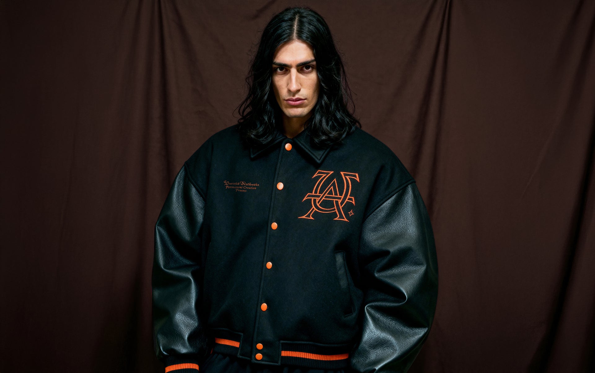 Untitled Artworks “Cult” varsity jacket in black with oversized fit and letterman-style embroidered graphics. front on model Untitled Artworks “Cult” varsity jacket in black with oversized fit and letterman-style embroidered graphics. flat front