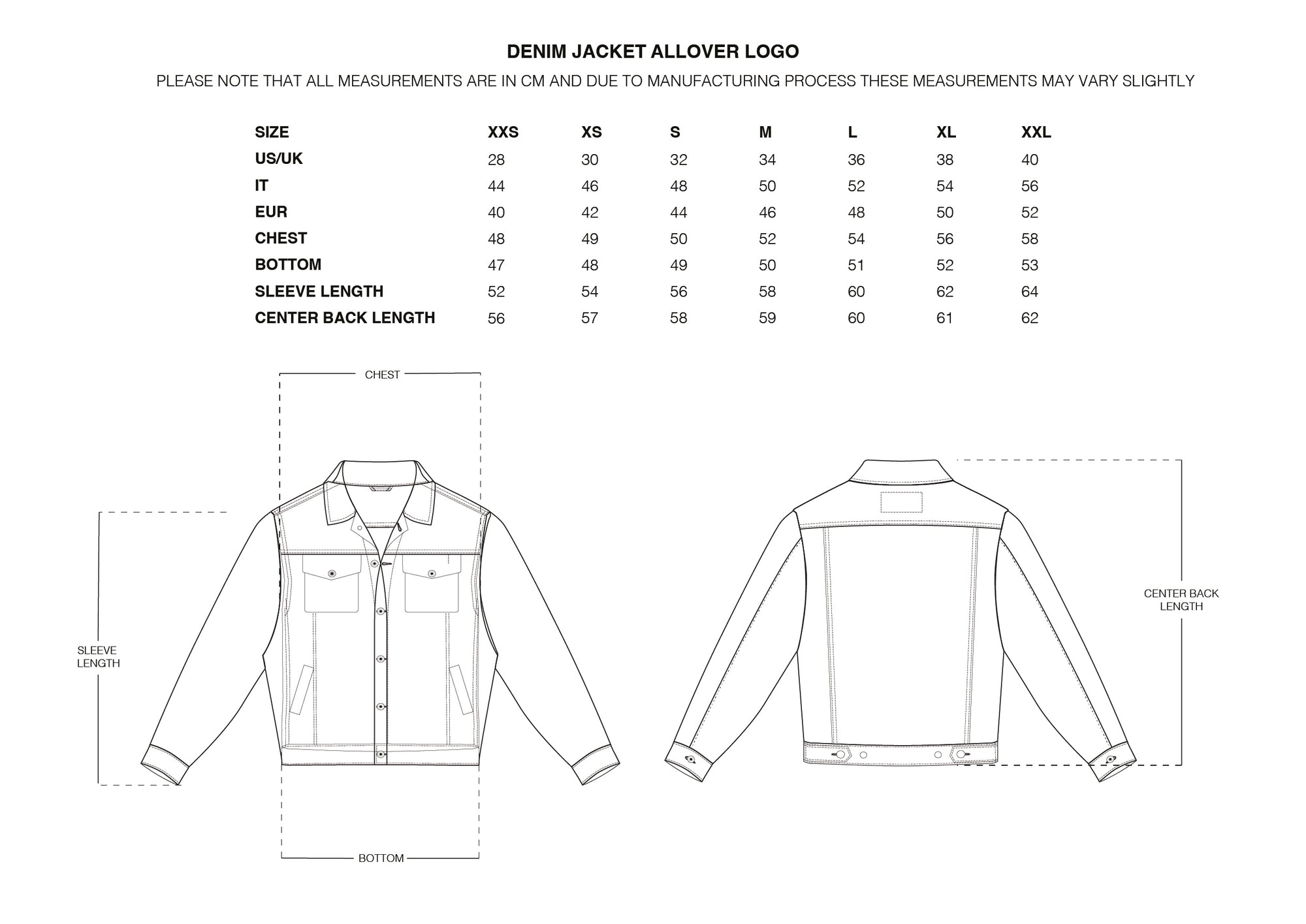 Long sleeve denim jacket. Spread collar. Button closure at front. Buttoned flap pockets at chest. Welt pockets at waist. Single button barrel cuffs. Adjustable buttoned tabs at hem. Tonal logo graphic printed. Logo-engraved bronze hardware.