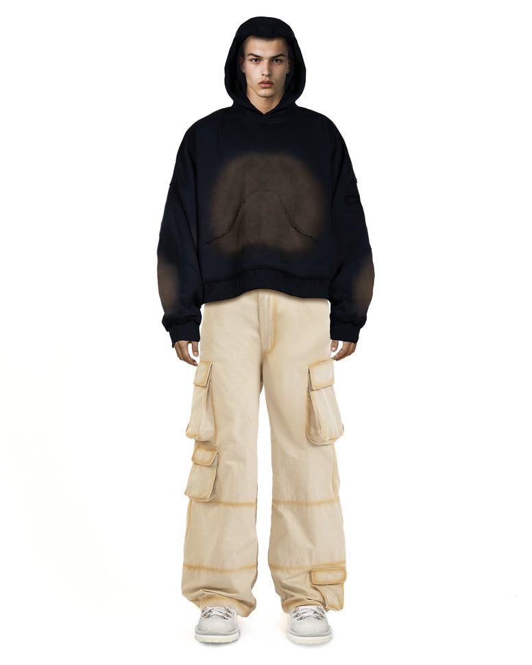 Hoodie made in french terry 100% cotton 320 gsm. Kangaroo patch pocket at waist. Bruise details at hoodie, cuffs and hem. Logo embroidery on patch with raw edges at left sleeve