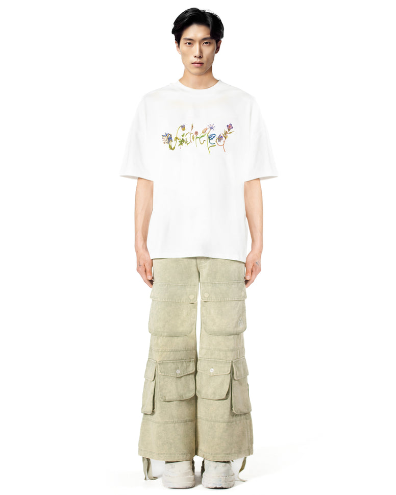 Give your outfit a floral twist with the Flower Lettering graphic T-shirt. This cotton tee features a creative print on the front that combines blooming flowers with stylized lettering — it's like street art meets botanical illustration. The result is a fun and artsy design that instantly catches the eye. The shirt itself has a relaxed fit and drop-shoulder construction for a trendy, comfortable look. Its soft jersey fabric feels great against the skin, and the crewneck collar keeps it classic.