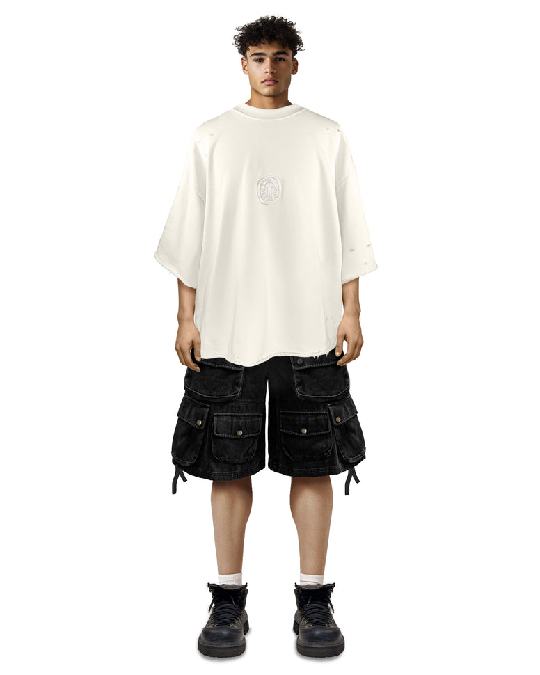 Crewneck short sleeve. Wide chest. Wide sleeves. Dropped shoulders. Consumed effect, bruise details at hems, collar, sleeves. All over distressed details. Front and back graphic patch with raw distressed edges. Raw hem and cuffs.