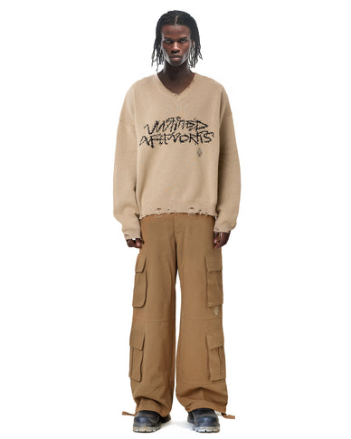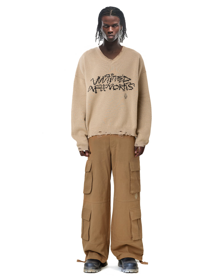• Rib knit distressed V-neck collar, cuffs, and hem