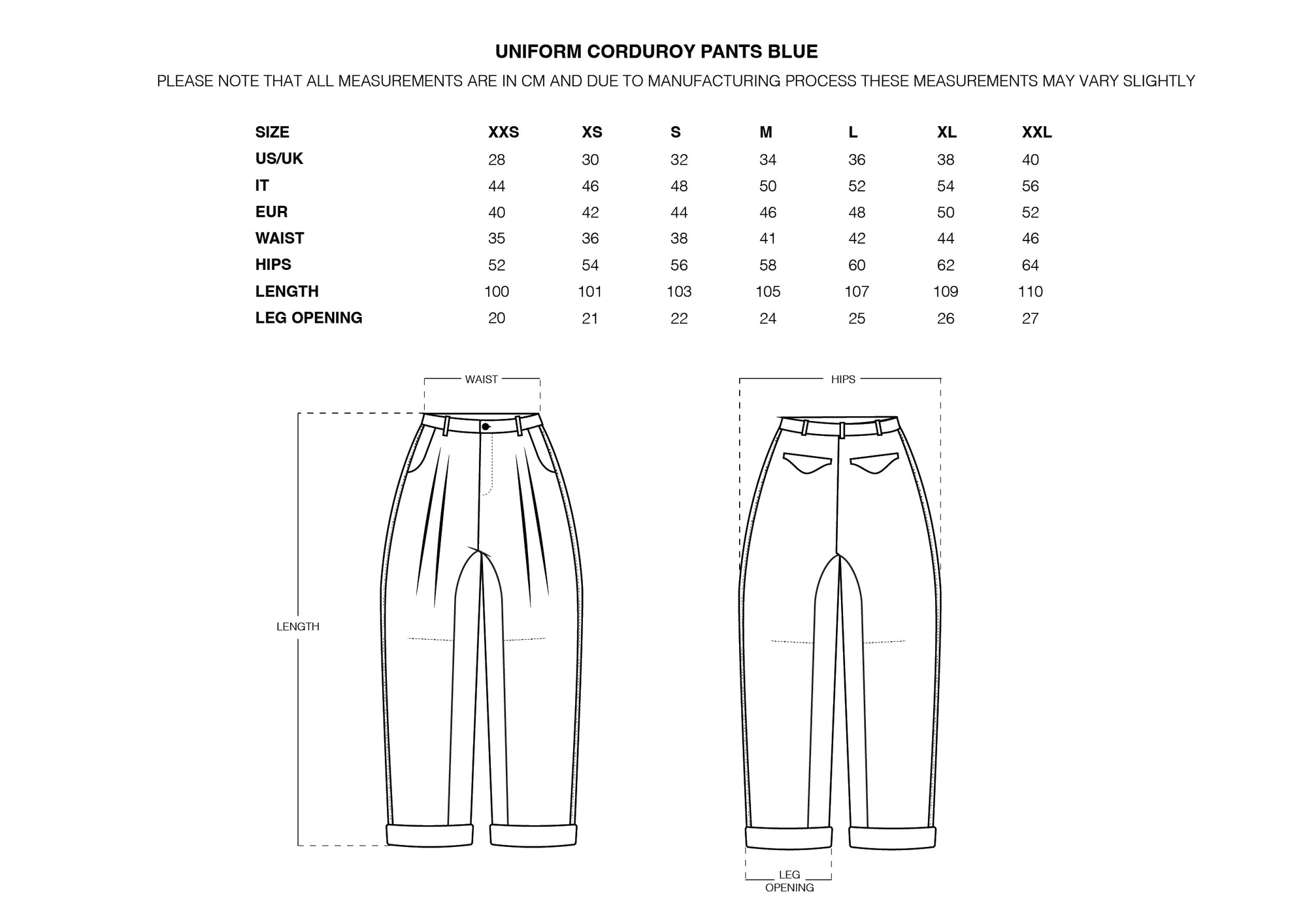 Upgrade your wardrobe with these blue corduroy pants cut in a wide-leg, relaxed silhouette. Made from heavyweight cotton corduroy, they sit at a mid-rise and feature belt loops plus four-pocket styling (two side pockets and two back flap pockets) for a classic workwear vibe. Front pleat details and a subtle stone-washed finish lend a touch of vintage character, making these trousers a versatile choice for both casual and contemporary streetwear looks.