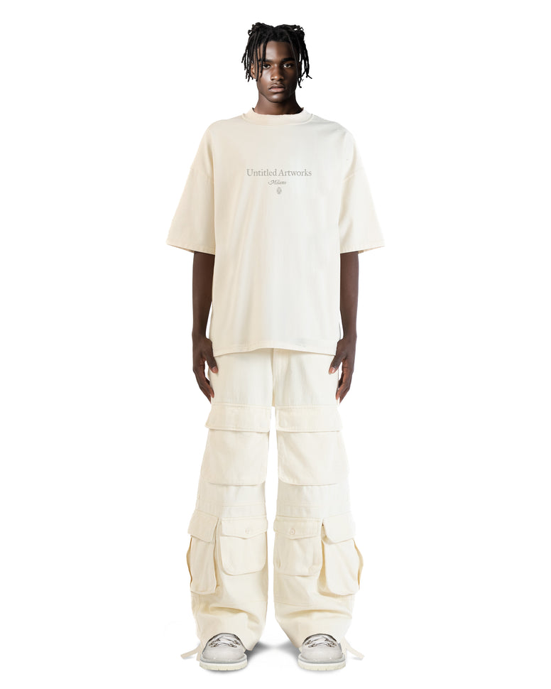 100% cotton t-shirt. Oversize fit. Short sleeve. Distress bruise edges at armhole, hem and collar. Screen print at front. Logo embroidery at the back.