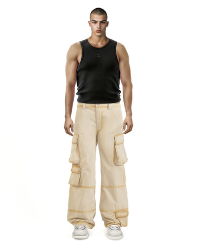 Relaxed-fit cargo pants. Mid-rise, button and zip closure. Logo embroidery on front side leg. Six-pocket styling: four front flap pockets, two back flap pockets, two side pockets. Stone wash and spray in seams edges..