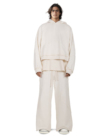 Hoodie made in french terry 100% cotton 320 gsm. Kangaroo patch pocket at waist. Bruise details at hoodie, cuffs and hem. Logo embroidery on patch with raw edges at left sleeve