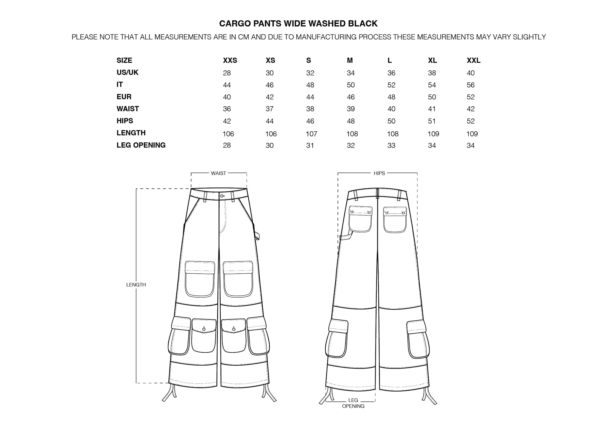 Make room in your wardrobe for the Wide Leg Black Cargo Pants from Untitled Artworks – a statement piece that brings together volume and utility. These cargo pants are cut from heavy cotton drill (511 GSM) and feature an exaggerated wide-leg, relaxed fit, giving them a bold silhouette and maximum comfort. They sit mid-rise and have a classic zip fly and button closure, with belt loops ready for your favorite belt. True to cargo style, this pair comes loaded with pockets: ten pockets in total, including six roomy flap pockets on the front (perfect for your phone, wallet, and more), two back flap pockets, and two handy side pockets for your hands. The black fabric has a stone-washed finish, softening the canvas and adding character with slight fading. Drawstrings at the hems let you cinch the ankles for a tapered look or leave them wide and flowing. A small embroidered logo on the leg and antique brass hardware round out the details. Whether you dress them up with boots or keep it casual with sneakers, these wide-leg cargo pants are sure to turn heads while carrying everything you need.